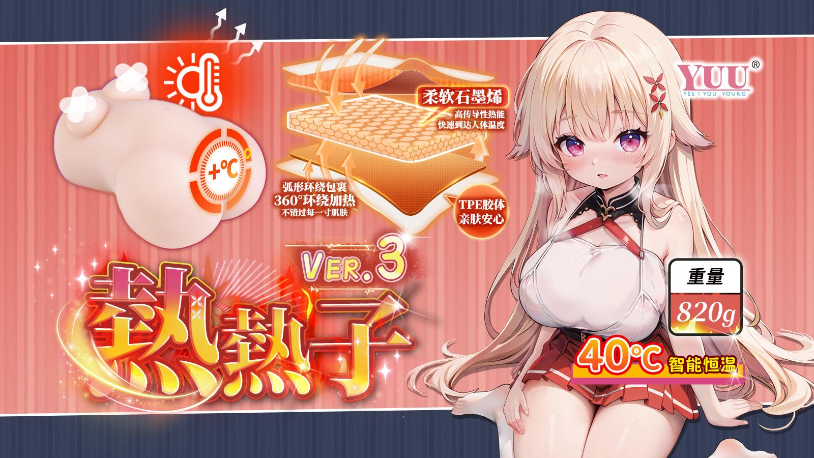 YUU热热子三代产品介绍丰满的胸部外形设计,软萌的身体曲线搭配可爱的一线天,带来更贴近实际的舒适体验一次充电,最高可持续使用50分钟,配和柔软的石墨烯和全身防水设计,使用、收纳都方便先进的石墨烯加热,不仅加热速度快,10分钟最高可达40℃,还能配和智能恒温设计,热感更持久属性信息品牌YUU品名热热子三代类型非贯通材质TPE刺激度适中特点通道体验更柔软的石墨烯加热名器产品参数杯体长度160mm杯体宽度120mm通道长130mm重量820克※存在手工测量或样品误差7